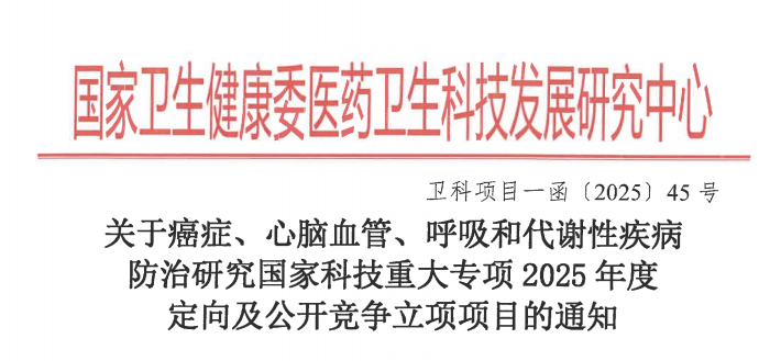 近日,国家卫生健康委医药卫生科技发展研究中心公布了关于癌症、心脑血管、呼吸和代谢性疾病(简称“四大慢病”)防治研究国家科技重大专项2025年度立项结果。